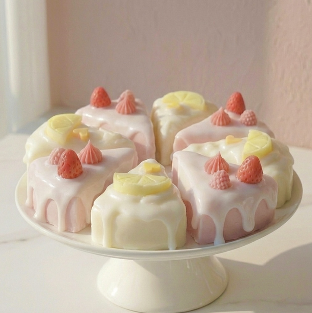 Une bougie artisanale en forme de cheesecake au citron, réalisée à la main avec de la cire de soja 100 % naturelle.