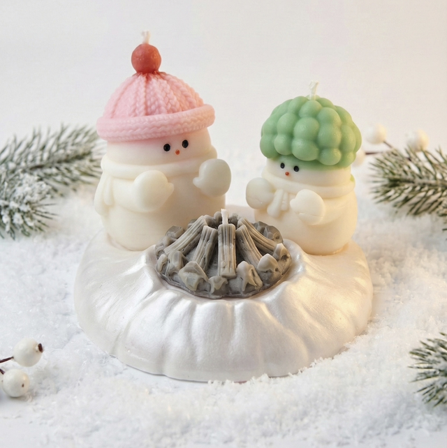 Dans un doux décor d’hiver, deux petits bonhommes de neige se retrouvent autour d’un feu de camp chaleureux. Ensemble, ils partagent un moment de tendresse et de complicité, créant une ambiance romantique et cocooning.